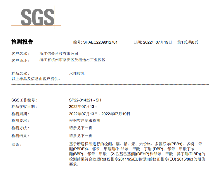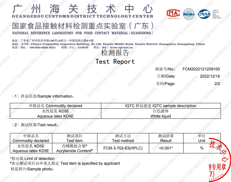 該膠水主要應用于特種食品紙無氟防水、防油的涂膠。涂膠后的紙柔軟度、防水性、防油性、拉伸強度等指標都達到特定的要求。該膠水按照ISO22000 標準要求生產,符合美國 FDA 標準和歐盟 BRCGS 認證。